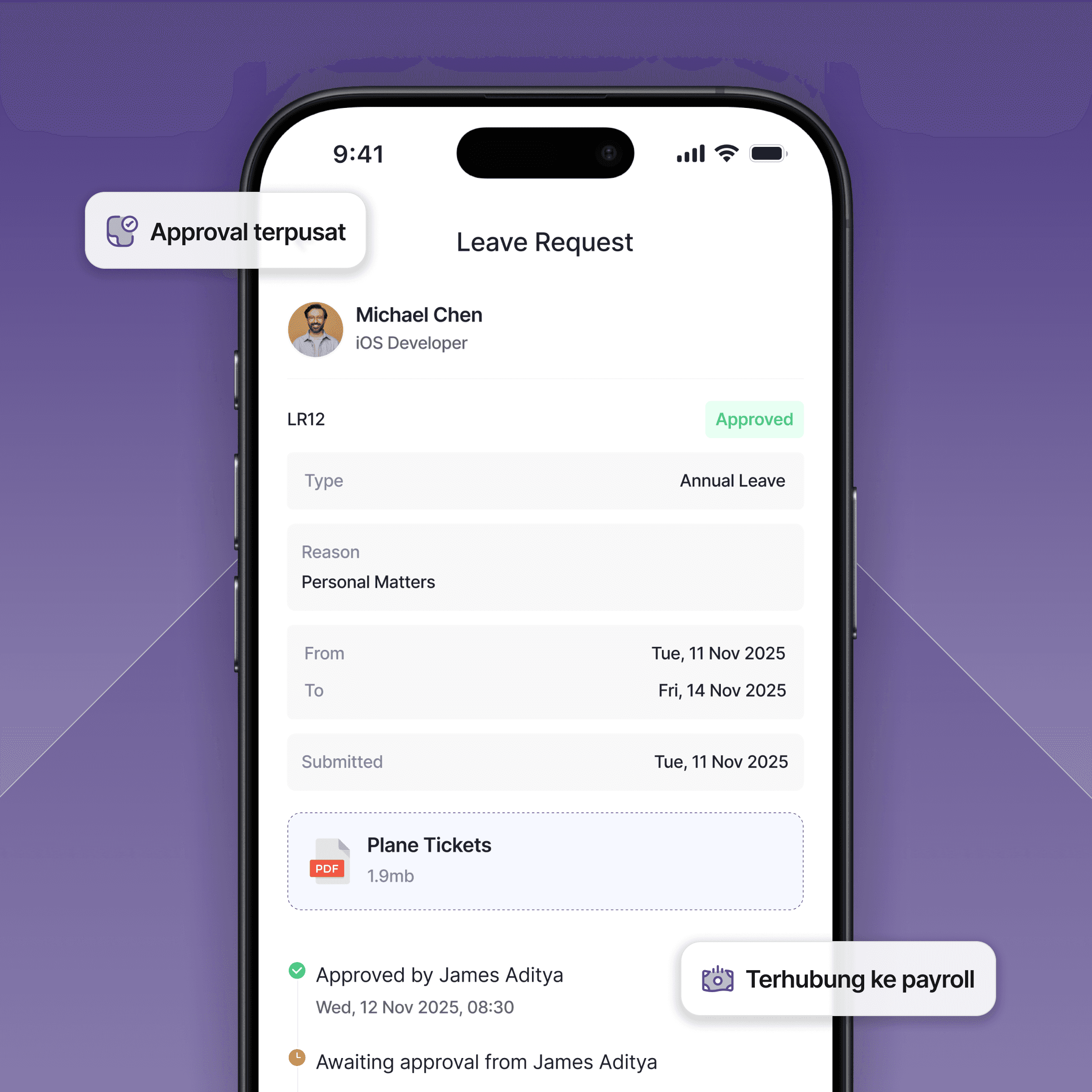 Sebelumnya approval cuti sering bolak-balik chat dan gak tercatat. Sekarang tinggal ajukan, masuk ke atasan, dan saya bisa lihat statusnya langsung. Lebih rapi, gak ada yang kelewat.
